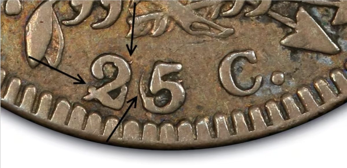 Niektóre egzemplarze mają błędy mennicze, jak ten z 1828 roku, gdzie podczas grawerowania nominał „25 C.” nakłada się na „50” PCGS