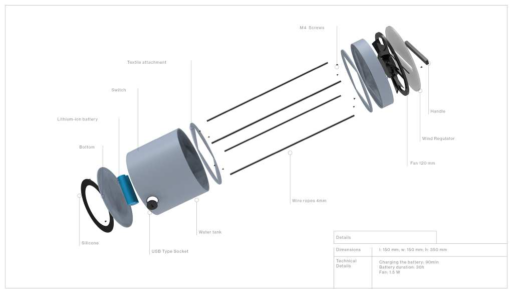 W górnej części urządzenia znajduje się wentylator osiowy niskiego napięcia, podobny do tego, który jest stosowany w komputerach osobistych. Wentylator ten zasysa gorące powietrze i przepuszcza je przez tekstylia 3D nasączone wodą, które są połączone ze zbiornikiem za pomocą systemu obrotowego, który je nawilża i napina.