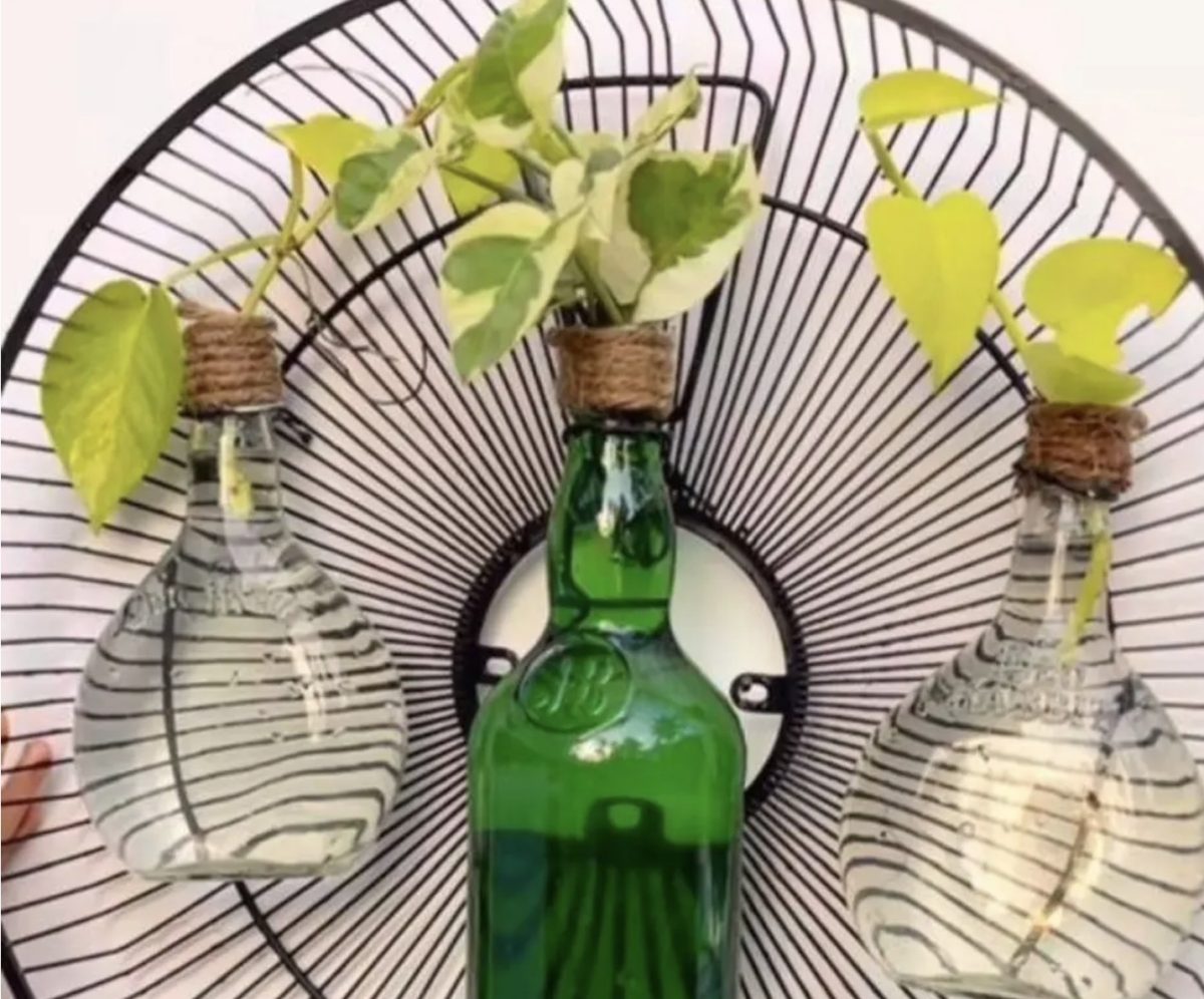 - Na koniec umieść rośliny w butelkach. W miarę wzrostu ich łodygi i liście zaplączą się w kratkę wentylatora, tworząc dynamiczny ogród wertykalny.